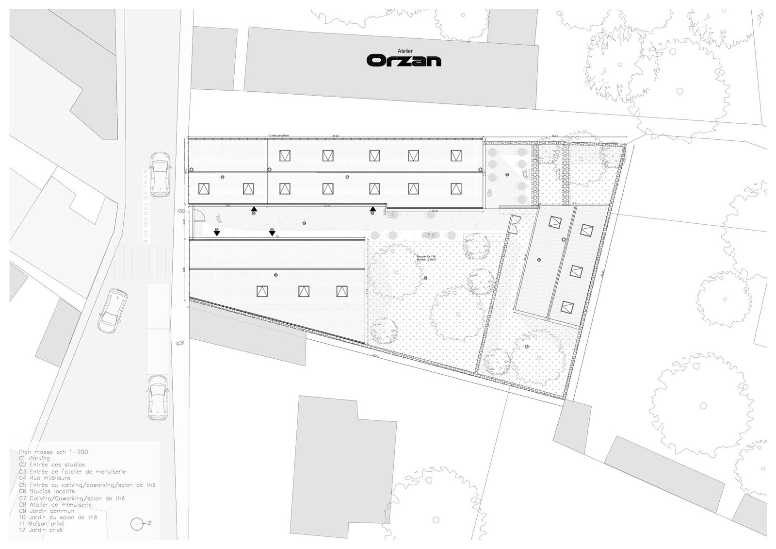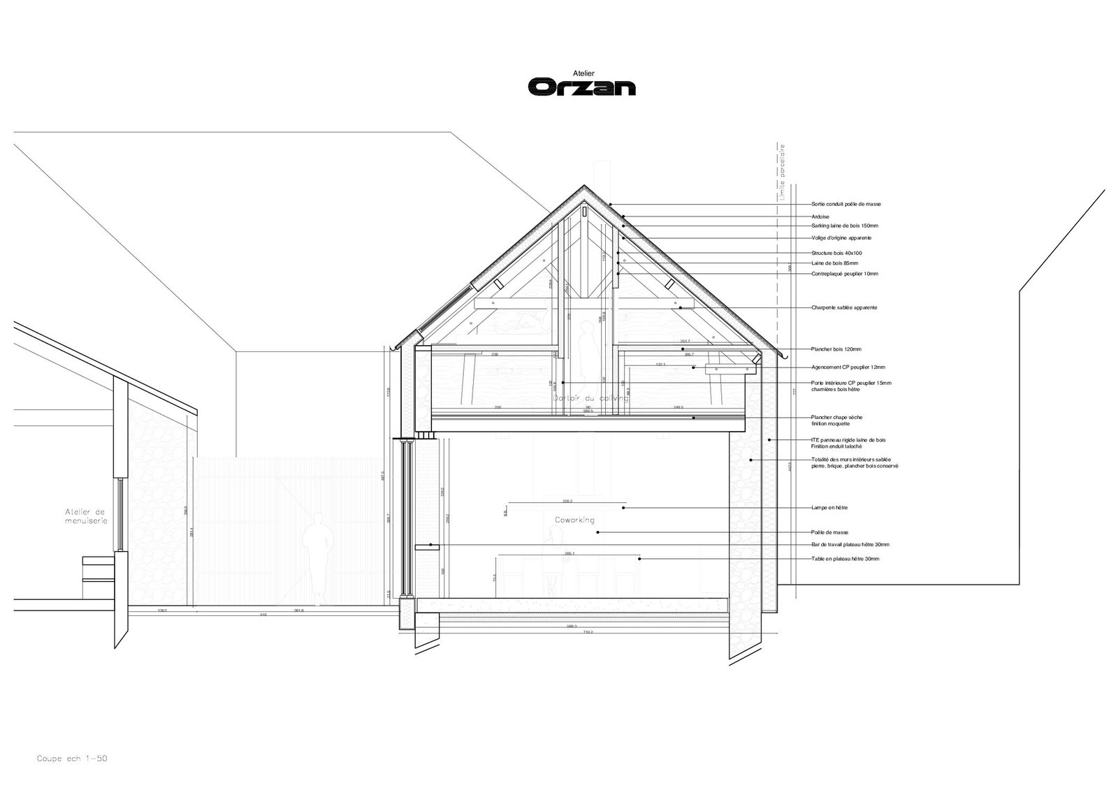 L'atelier de menuiserie est une construction neuve en ossature bois, qui vient créer une "rue" intérieur à la frontière entre lieu public et privé, permettant de lier les différents espaces des Briques.
