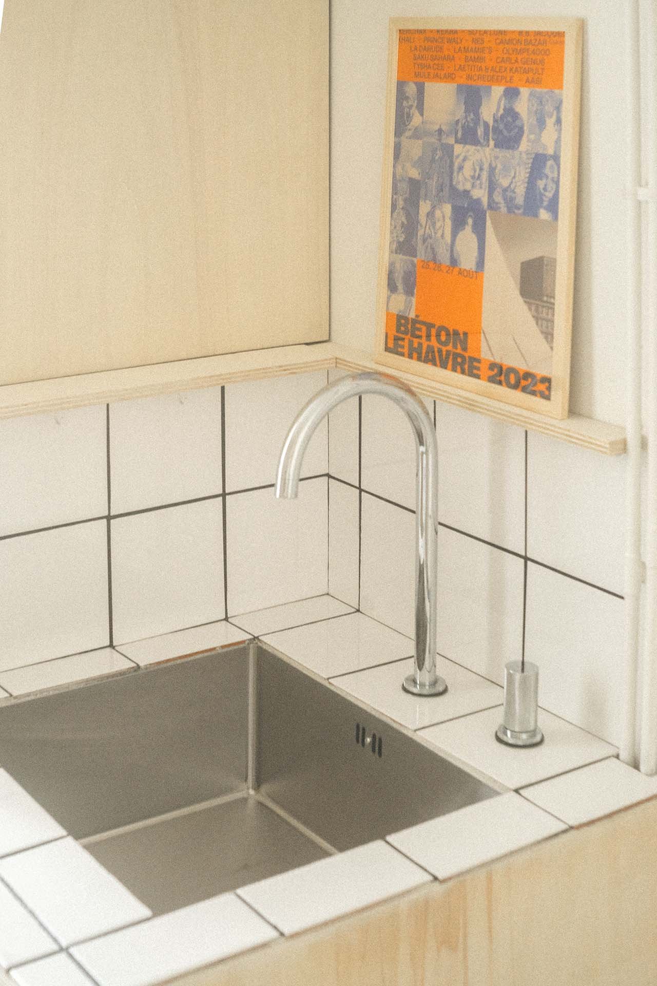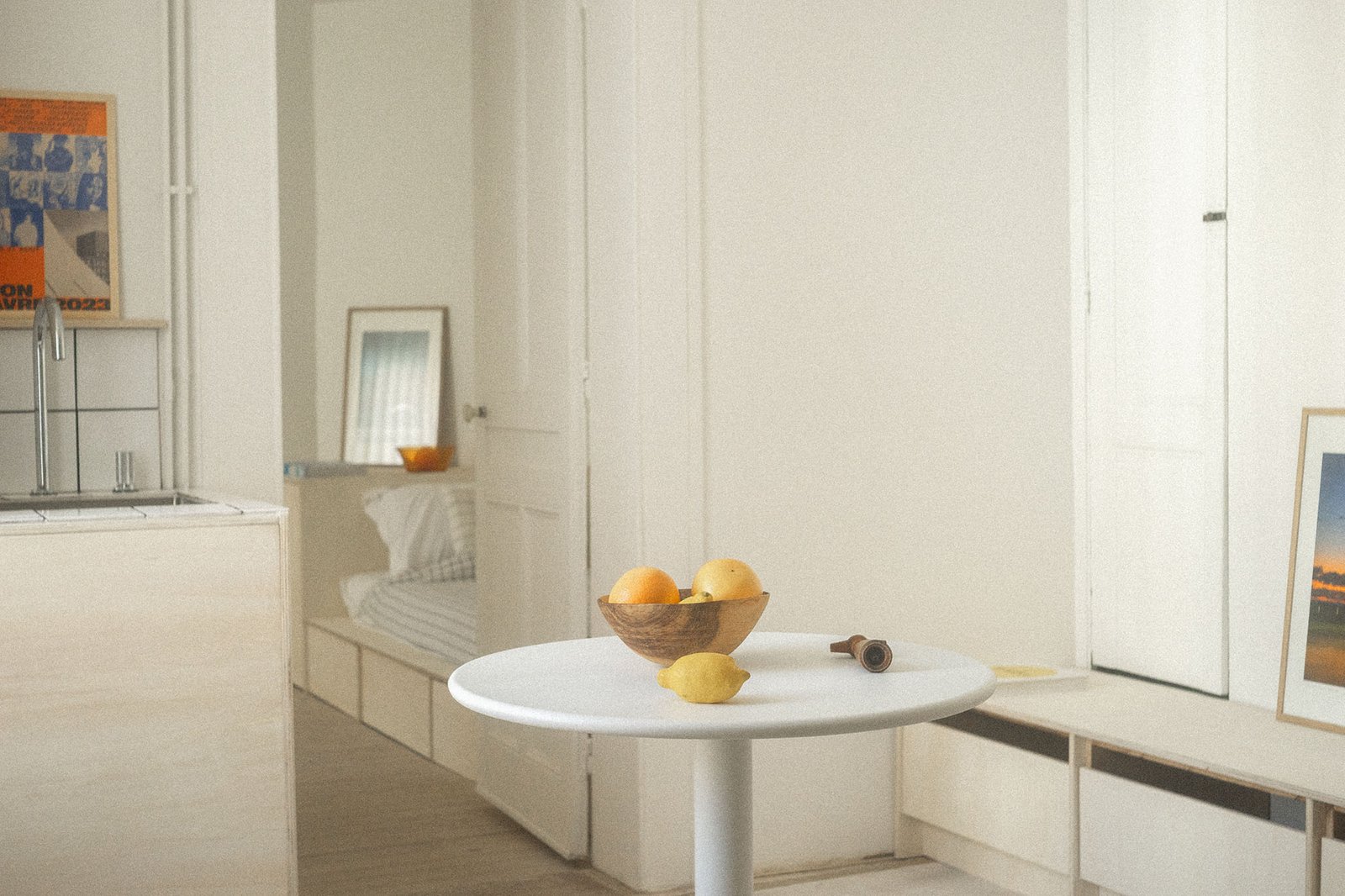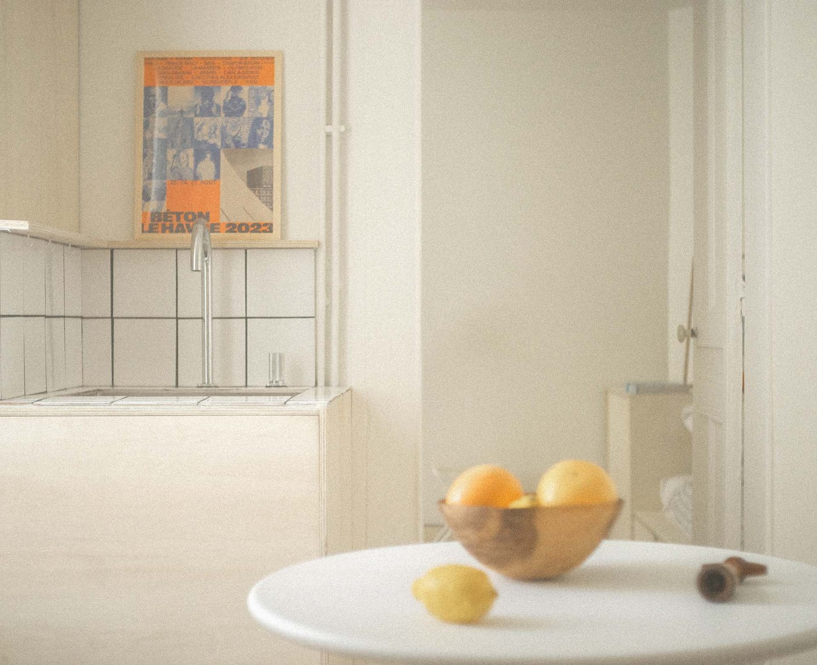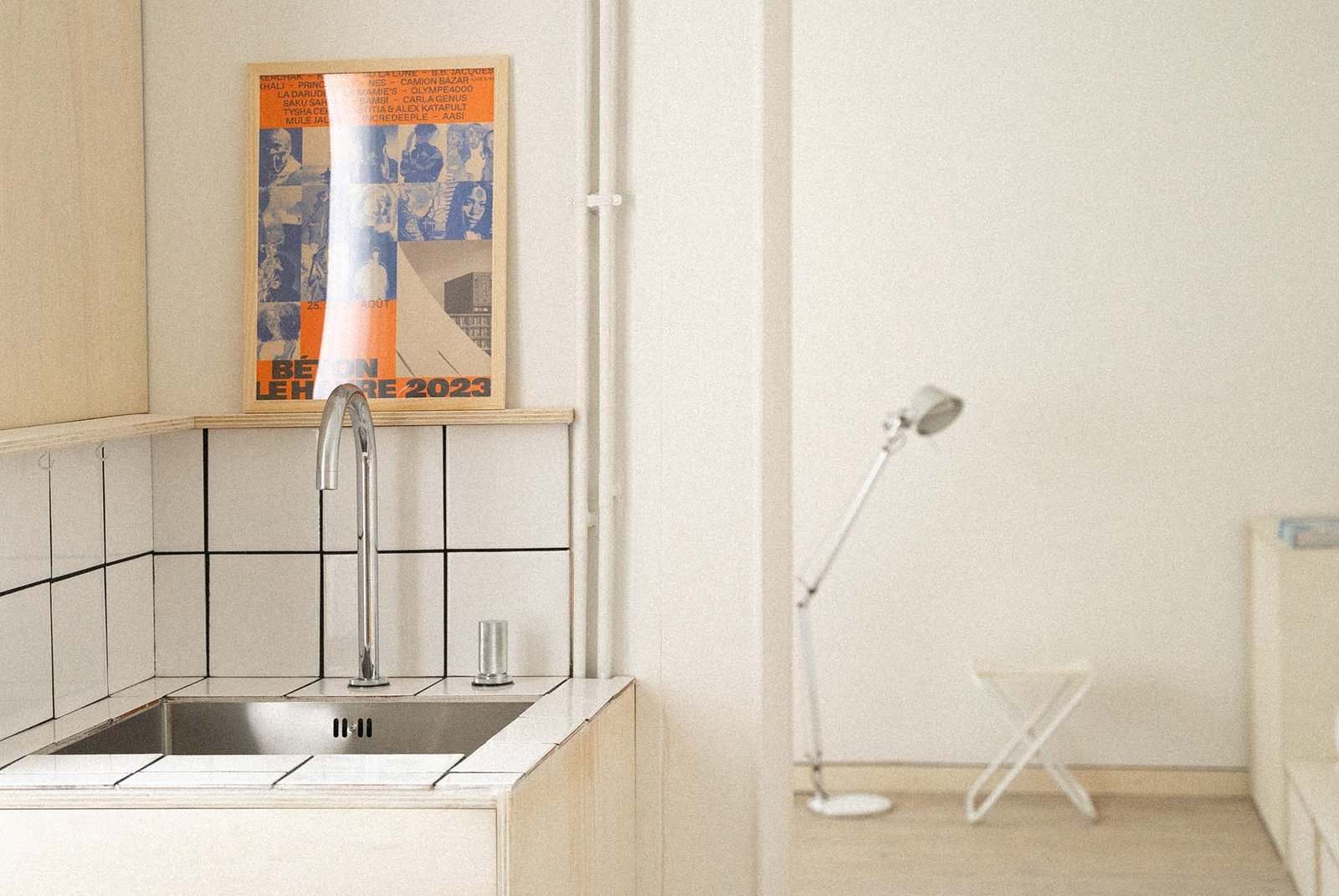 Dans cette rénovation d’appartement d’étudiant chaque détail est pensé pour répondre aux exigences pratiques et à l’optimisation des espaces tout en valorisant l’essence du lieu. l’agencement epuré des volumes se mêle harmonieusement à des choix de matériaux durables. Murs en laine de bois et Fermacell, finition à la peinture à l’algue, mobilier sur mesure en peuplier français, et parquet d’origine restauré à l’huile de lin pour une atmosphère chaleureuse et naturelle. La dalle béton, soigneusement conservée et vernie, affirme son caractère tout en intégrant la démarche de respect des matériaux existants. Le réemploi de la faïence existante dans la salle de bain témoigne la volonté d’ancrer le projet dans une approche écoresponsable.