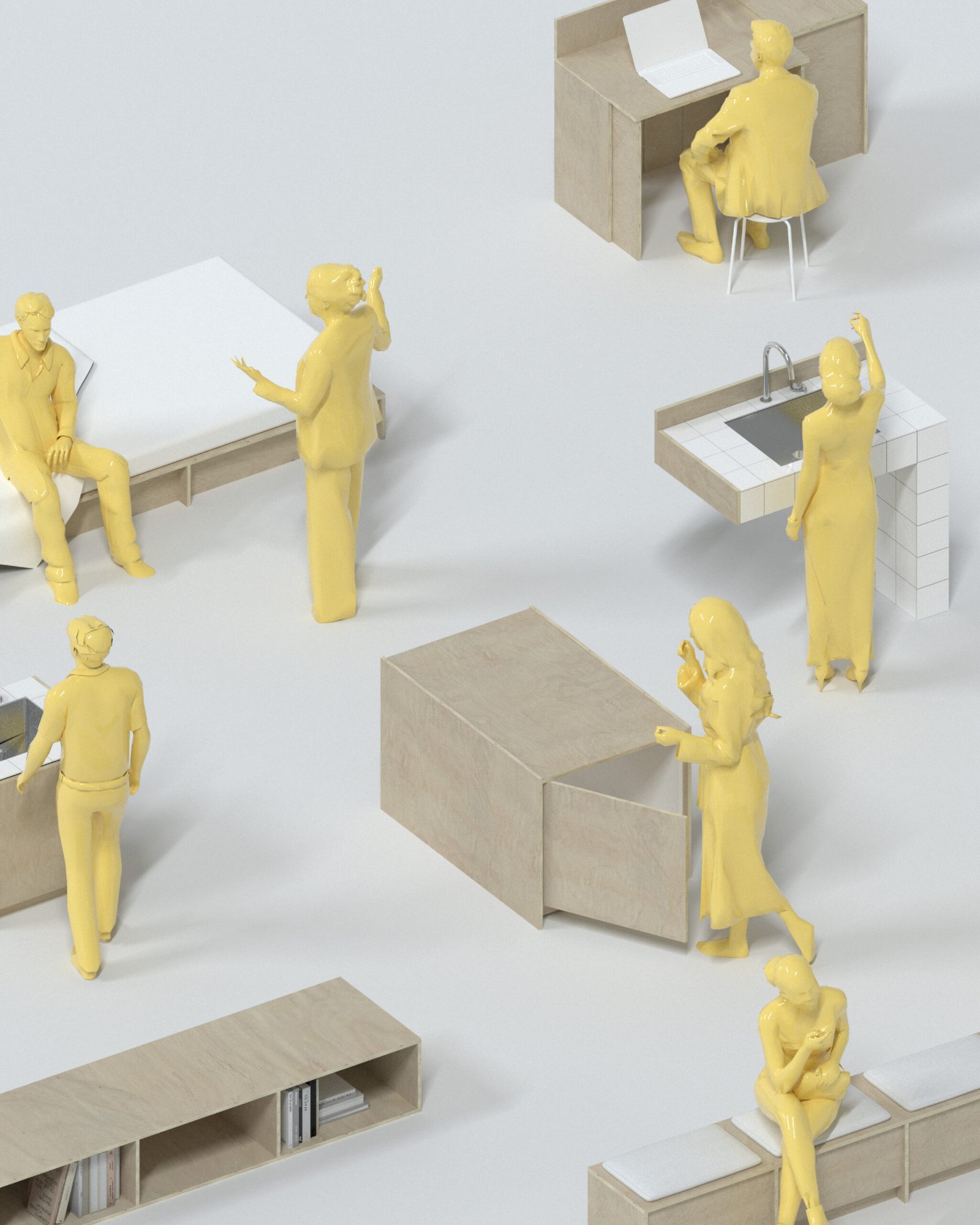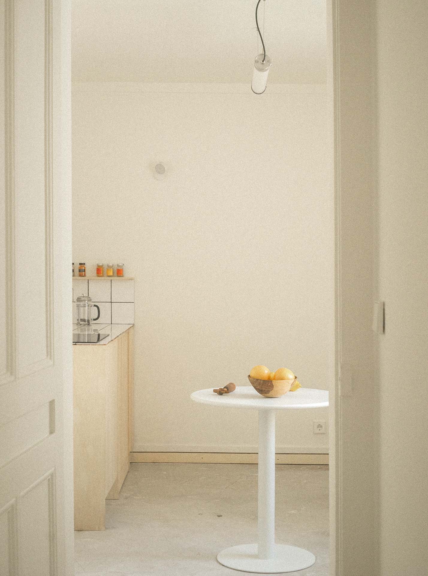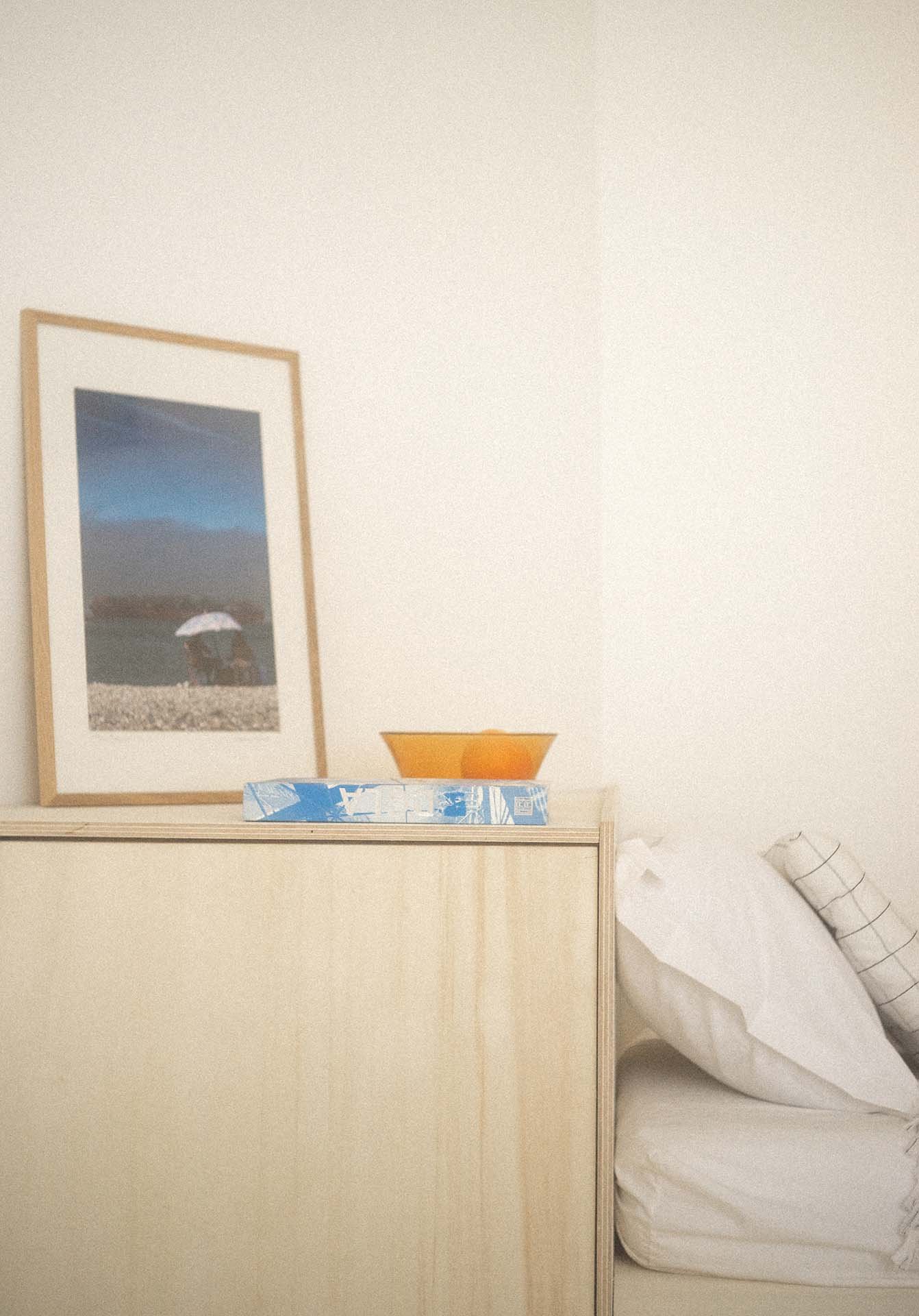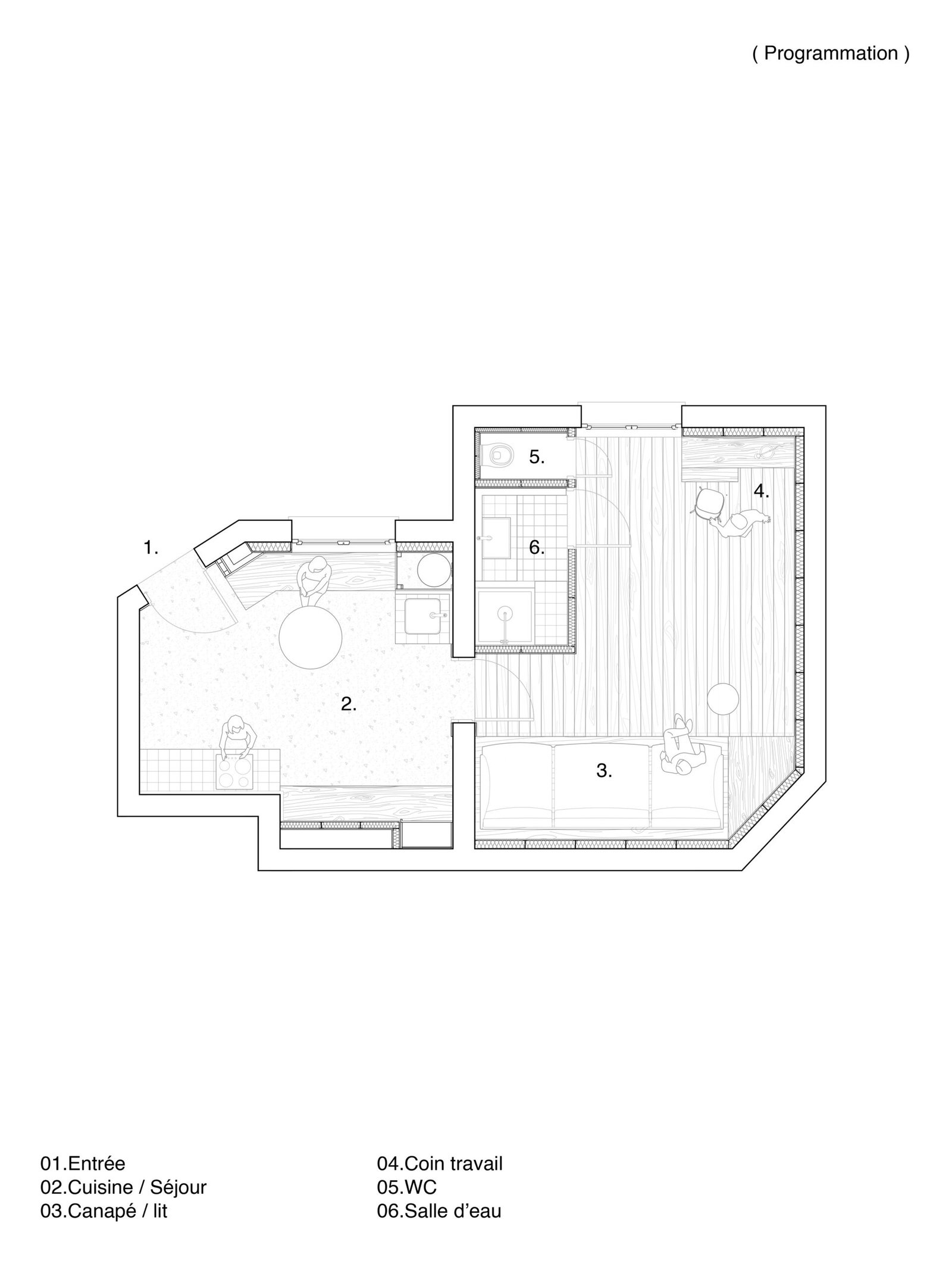 Dans cette rénovation d’appartement d’étudiant chaque détail est pensé pour répondre aux exigences pratiques et à l’optimisation des espaces tout en valorisant l’essence du lieu. l’agencement epuré des volumes se mêle harmonieusement à des choix de matériaux durables. Murs en laine de bois et Fermacell, finition à la peinture à l’algue, mobilier sur mesure en peuplier français, et parquet d’origine restauré à l’huile de lin pour une atmosphère chaleureuse et naturelle. La dalle béton, soigneusement conservée et vernie, affirme son caractère tout en intégrant la démarche de respect des matériaux existants. Le réemploi de la faïence existante dans la salle de bain témoigne la volonté d’ancrer le projet dans une approche écoresponsable.